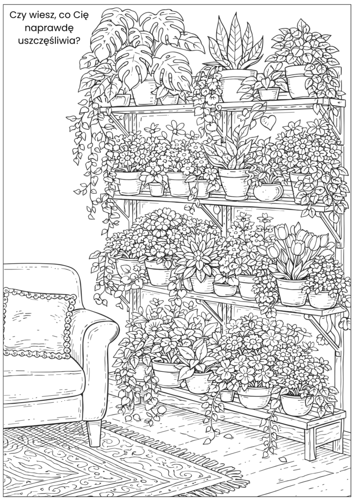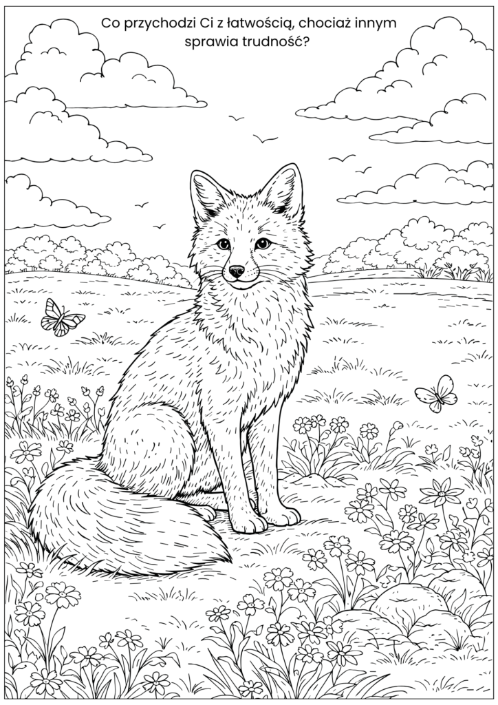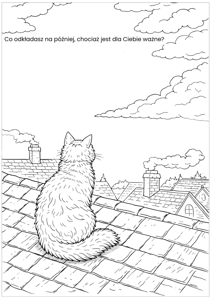 Nie ma tu „właściwych” odpowiedzi. Daj sobie przestrzeń, zatrzymaj się i pomyśl o tym, co jest dla Ciebie ważne. Kolorowanie pozwala odpocząć, a pytania mogą prowadzić do ciekawych przemyśleń.